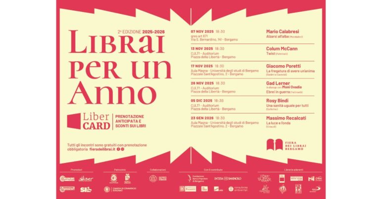 Torna la 2^ edizione di Librai per un Anno, la rassegna letteraria che promuove l’azione dei librai indipendenti di Bergamo durante tutto l’anno, oltre la consueta Fiera dei Librai. Dal 7 novembre 2025 saranno ospiti: Mario Calabresi, Colum McCann, Giacomo Poretti, Gad Lerner, Moni Ovadia, Rosy Bindi, Massimo Recalcati Un appuntamento periodico che, mese dopo mese, permetterà al pubblico di incontrare gli scrittori e la loro opera, ascoltare le loro idee, approfondire le uscite letterarie più recenti. Al di fuori della consueta cornice della Fiera dei Librai, ma dentro le rassicuranti pagine di un libro, questa serie di appuntamenti vuole colmare i mesi e le settimane che intercorrono fra le diverse edizioni di uno degli appuntamenti più amati dai bergamaschi e non solo. La manifestazione è espressione della vitalità di un gruppo di librerie indipendenti di città e provincia – Libreria Arnoldi, Cartolibreria Nani, Libreria Palomar, Il Parnaso libri&natura, Punto a capo libri, Libreria Incrocio Quarenghi, Libreria San Paolo, Elle Libri – che con la loro presenza attiva sul territorio promuovono ogni giorno il libro e la lettura, rafforzando il legame tra cultura e comunità. Programma e prenotazioni su Fiera dei Librai Bergamo | Rassegna Librai per un anno Tutti gli incontri sono gratuiti L’evento è promosso da Confesercenti Bergamo, Promozioni Confesercenti, Li.Ber Associazione Librai Bergamschi e Sil e patrocinato da Comune, Provincia e Camera di Commercio di Bergamo.