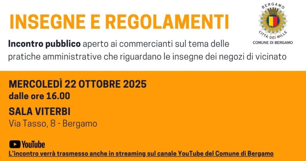 Mercoledì 22 ottobre alle 16.00 in Sala Viterbi presso la Provincia di Bergamo, in via Tasso 8, il Comune di Bergamo invita i commercianti a partecipare all’incontro pubblico “Insegne e...