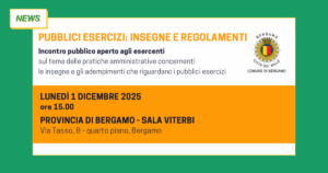 Lunedì 1 dicembre alle 15.00 in Sala Viterbi presso la Provincia di Bergamo, in via Tasso 8, il Comune di Bergamo invita i commercianti a partecipare all’incontro pubblico “Pubblici esercizi: insegne e regolamenti”. L’incontro sarà trasmesso anche in streaming sul canale YouTube del Comune di Bergamo. L’appuntamento si propone di chiarire le tante domande e richieste sul tema delle pratiche amministrative concernenti le insegne e gli adempimenti che riguardano i pubblici esercizi. È infatti rivolto ai commercianti e agli operatori del settore interessati ad approfondire normative, procedure e modalità di installazione per le insegne. L’incontro, inoltre, vuole favorire il dialogo tra amministrazione e imprese e semplificare l’accesso alle informazioni utili per la gestione delle attività commerciali. Un’occasione utile per chiarire dubbi e confrontarsi direttamente con gli enti competenti. L’iniziativa è promossa dall’Assessorato al Commercio del Comune di Bergamo, con la partecipazione dell’Assessorato all’Innovazione e Semplificazione, della Polizia Locale e dei Servizi Tributi. Collaborano all’organizzazione Confcommercio, Confesercenti e il Distretto Urbano del Commercio.