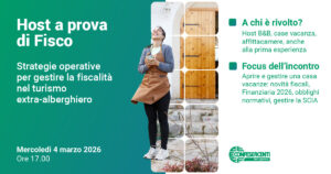 Proseguono gli incontri online gratuiti dedicati a titolari e gestori di B&B, case vacanza e affittacamere promossi da Confesercenti Bergamo insieme ad AIGO Confesercenti Bergamo, con l’obiettivo di sostenere la crescita professionale degli host, oggi figure imprenditoriali sempre più centrali per l’economia turistica del territorio. Dopo il primo webinar dello scorso anno, dedicato alla gestione dei portali di prenotazione, il nuovo appuntamento formativo è in programma mercoledì 4 marzo alle ore 17.00 in modalità online. L’incontro sarà focalizzato sugli aspetti fiscali e porterà il titolo: “Host a prova di Fisco. Strategie operative per gestire la fiscalità nel turismo extra alberghiero”. All’incontro interverranno: Cesare Rossi, segretario provinciale AIGO Confesercenti Bergamo Michela Marrone, referente provinciale AIGO Confesercenti Bergamo Stefania Giossi, responsabile servizi Confesercenti Bergamo Matteo Pesenti, membro del direttivo AIGO Confesercenti Bergamo Il webinar offrirà un approfondimento operativo sugli aspetti fiscali e gestionali che oggi un host deve affrontare per lavorare in modo consapevole e conforme alla normativa vigente.Tra i temi trattati: l’apertura e la gestione di una casa vacanze alla luce della nuova Legge di Bilancio, rischi e opportunità per gli host, obblighi legati all’apertura della Partita IVA e valutazioni di convenienza, gestione fiscale degli appartamenti affidati a property manager, requisiti e certificazioni per la SCIA di inizio attività. L’iniziativa rappresenta un’importante occasione per chiarire dubbi, aggiornarsi sulle ultime disposizioni normative e acquisire strumenti pratici per una gestione più efficace e sicura delle attività extra-alberghiere. La partecipazione è gratuita e aperta a tutti previa iscrizione.Se desideri partecipare, iscriviti subito compilando la richiesta di contatto qui sotto!